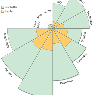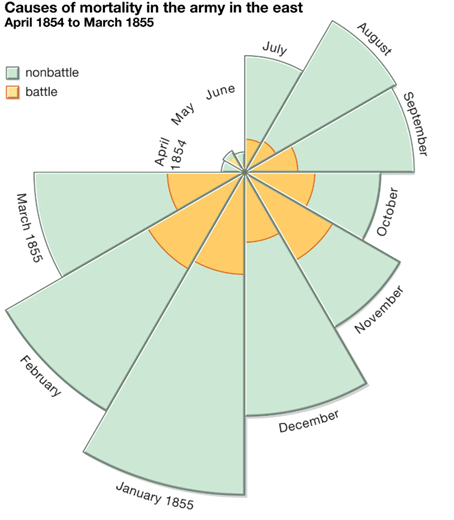 A seguir gráfico Baseado em "Notas sobre Assuntos que Afetam a Saúde, Eficiência e Administração Hospitalar do Exército Britânico", de Florence Nightingale, 1858.